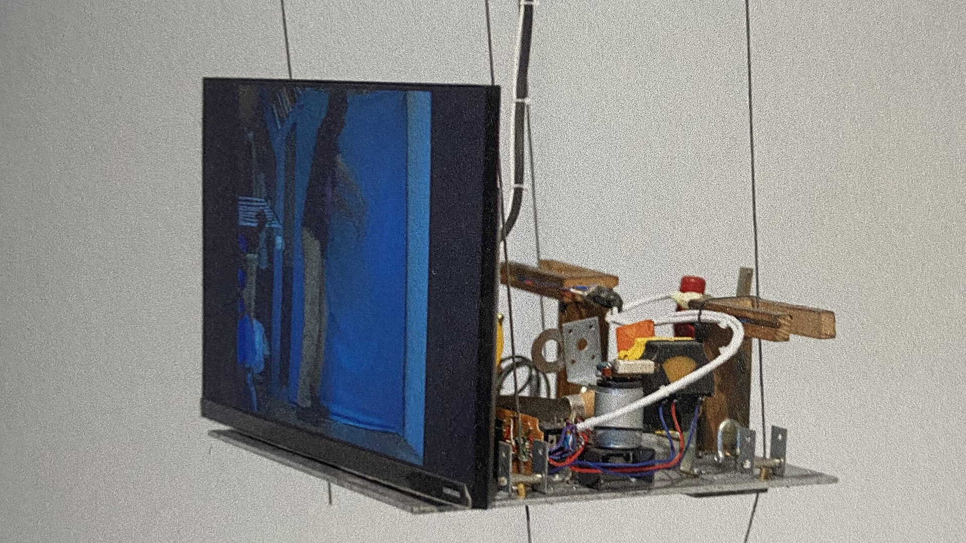 A computer-controlled monitor hanging from the ceiling swings in time with the young man on the screen pushing the inside of the structure. We perceive that he is the boy controlling the movement. Although the visual is quite simple, the solution – synchronizing the swinging motion of the structure, the movement on the screen, and the swing – is quite complicated digital technology. The cause-and-effect relationships appear alternately – visually and in a real way.
